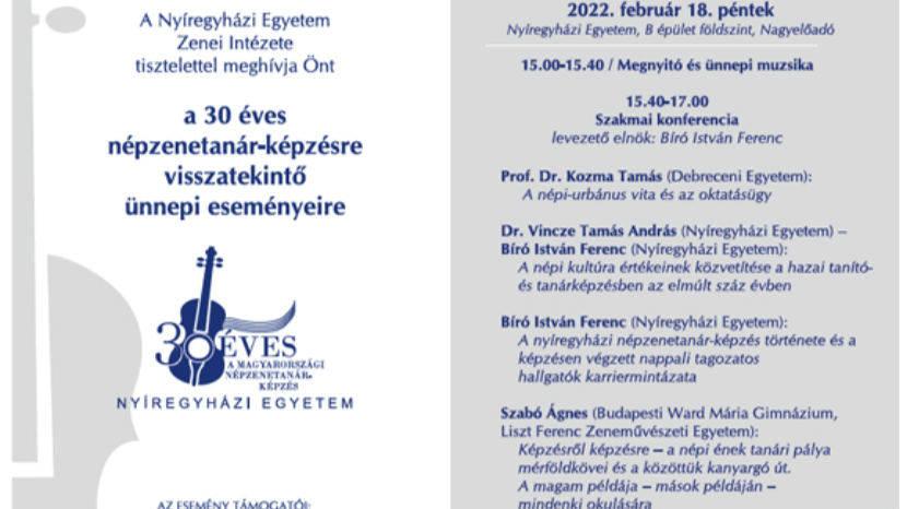 A Nyíregyházi Egyetem Zenei Intézete kétnapos rendezvény keretében ünnepli meg a népzene képzés 30 éves jubileumát. Pénteken konferencia és ünnepi koncert lesz, majd szombaton a Sóstói Múzeumfaluban a böllérversenyen vesznek részt a hagyományőrző programon. Háromszáznál is több volt hallgató jelezte érkezését, így több évfolyamtalálkozóra is sor kerül.