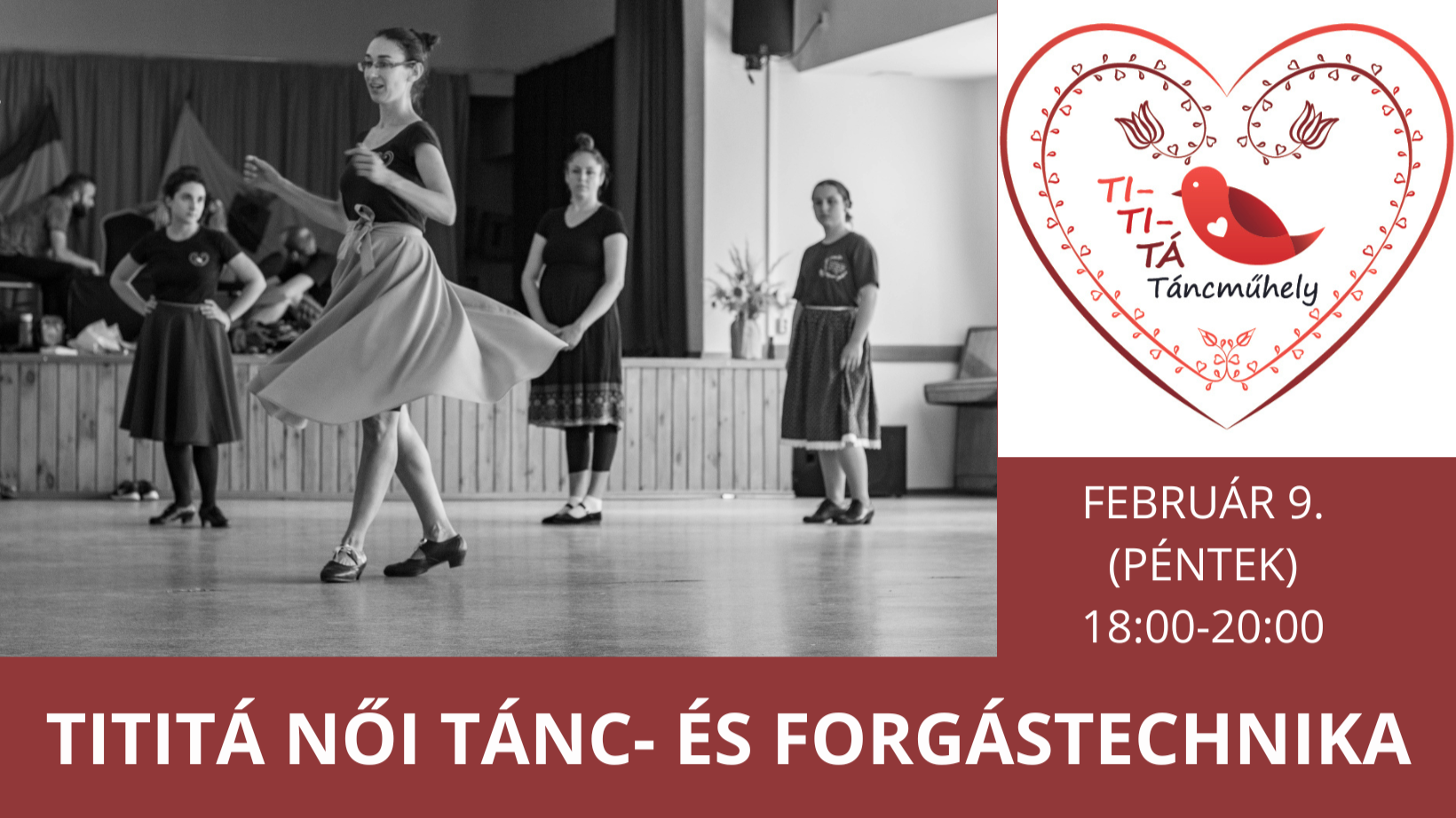 Női tánc- és forgástechnika, testtudat- és mozgáskoordinációs gyakorlatok pici folkjógával fűszerezve a TITITÁ idei párostánc- tanfolyamainak kiegészítéseként.