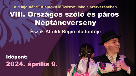 Művészeti Iskolánk szervezésében kerül megrendezésre az Oktatási Hivatal által kiírt, VIII. Országos szóló és páros Néptáncverseny Észak-Alföldi régiójának elődöntője.