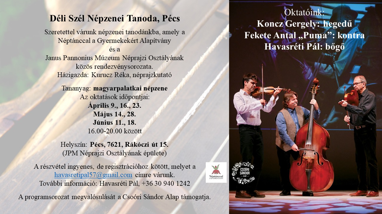 Szeretettel várunk népzenei tanodánkba, amely a Néptánccal a Gyermekekért Alapítvány és a Janus Pannonius Múzeum Néprajzi Osztályának