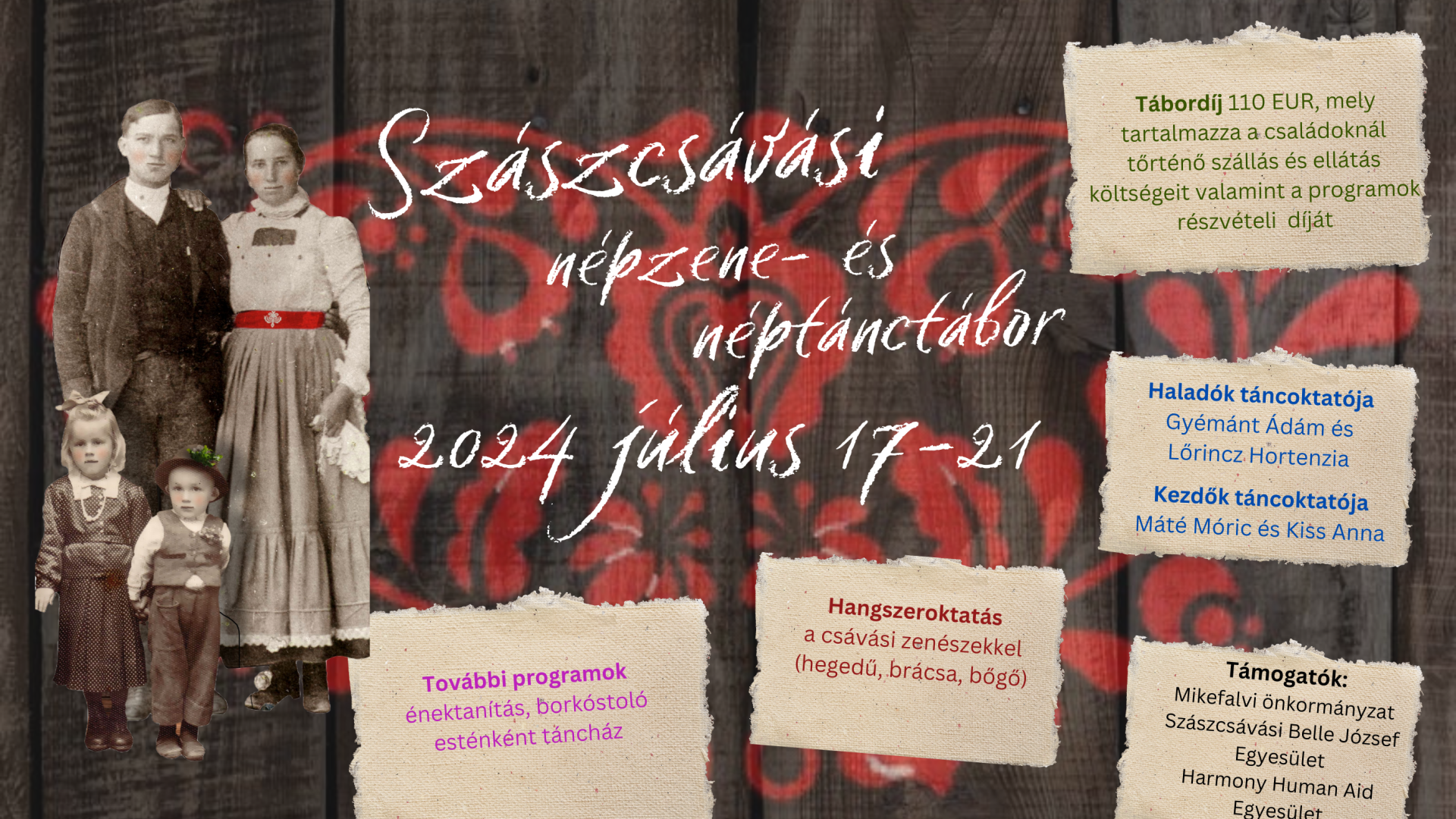 A tábor művészeti vezetője Gyémánt Ádám, a népművészet ifjú mestere, aki Lőrincz Hortenziával együtt lesz a haladók táncoktatója, a kezdőket pedig Máté Móric és Kiss Anna fogja bevezetni a szászcsávási táncok és a vámosgálfalvi férfitáncok rejtelmeibe.