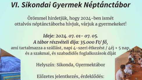 VI. SIKONDAI GYERMEK NÉPTÁNCTÁBORUNKBA a jelentkezési határidő e hónap vége, azaz április 30., amit az előleg befizetésével tudunk véglegesíteni.