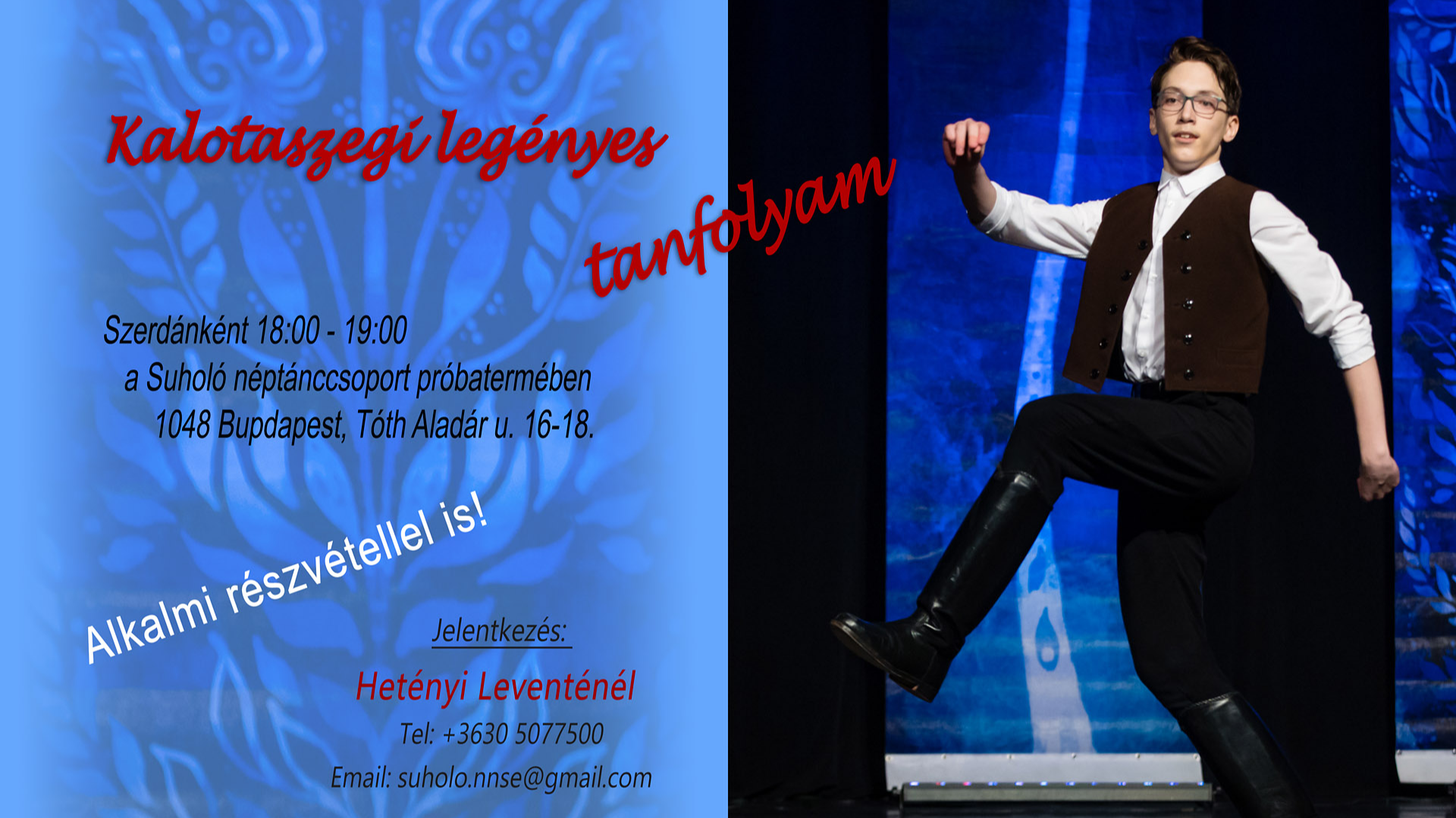 Díjak és további részletek az űrlapon vagy a https://suholo-ncs.hu/programok-2024-25/kalotaszegi-tanctanfolyamok/ oldalon. Szükséges felszerelés és más tudnivalók pedig a visszaigazoló levélben.