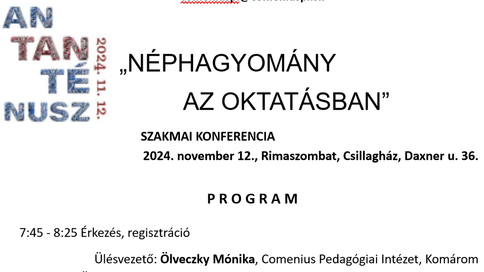 A Rima-folyó menti felvidéki város, Rimaszombat ad otthont november 12-én a Néphagyomány az oktatásban című szakmai konferenciának a COMENIUS Pedagógiai Intézet, Komárom és a Hagyományok Háza Hálózat – Szlovákia rendezésében. Az élénk érdeklődés övezte szimpóziumon hat előadás és gyakorlati foglalkozás várja a szakembereket.