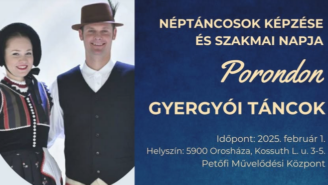 A Békés Megyei Néptáncosok Szövetsége Közhasznú Egyesület, a Harangos Néptáncegyüttes és a Petőfi Kulturális Központ 2025. február 01-jén, Orosházán néptáncosok számára szakmai napot hirdet. Oktatnak: Farkas Ágnes és Farkas Tamás.