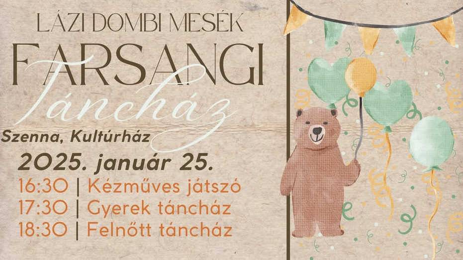 Farsangi hangulatban vár mindenkit a Szennai kultúrház, ahol a Lázi dombi Kulturális Egyesület szervezésében táncházat rendeznek kicsiknek és nagyoknak egyaránt.