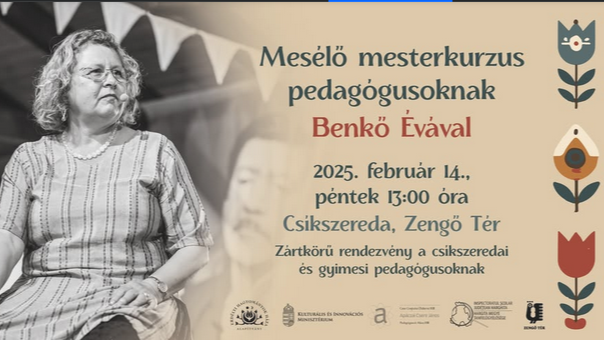 A Hargita Megyei Tanfelügyelőség az Erdélyi Hagyományok Háza Alapítvánnyal együtt február 14-én mesélő mesterkurzust szervez Benkő Évával az csíkszeredai és gyimesi tanítóknak, pedagógukosknak.