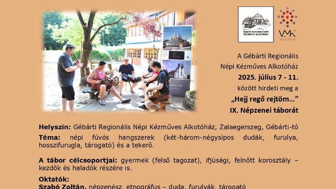 A Gébárti Regionális Népi Kézműves Alkotóház 2025. július 7 - 11. között hirdeti meg a „Hejj regő rejtöm…” IX. Népzenei táborát
