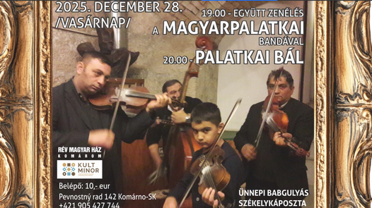 19:00-Együtt zenélés a Magyarpalatkai bandával20:00-Palatkai bálünnepi babgulyásszékelykáposztaBelépő: 10,-euró