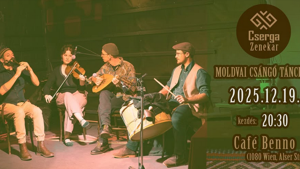 A Cserga zenekar moldvai csángó tánczenét játszik. Többszörösen is kötődünk Bécs városához. Ez év elején itt alakult meg a formáció, eleinte duóként (furulya-koboz), majd kiegészülve (dob, hegedü) több sikeres Budapesti táncházat tartottunk, de vágytunk a “szülövárosban” is megmutatkozni. Hosszú keresgélés és szervezés után, végre sikerült. Nagy örömmel jelenthetjük be december 19-ei táncházunkat, aminek a Café Benno ad otthont.