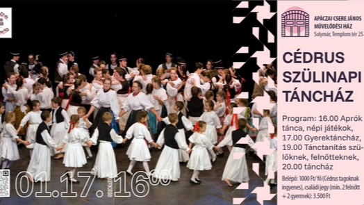 A Magyar Örökség-díjas Cédrus Táncegyüttes 27. születésnapja alkalmából szeretettel vár mindenkit az ünnepi táncházba! Élő zene, tánc- és énektanítás, kézműveskedés, hajfonás és persze zsíroskenyér is lesz! A talpunk alá való muzsikáról a Fix Stimm zenekar gondoskodik, a táncokat a Cédrus Táncegyüttes tagjai tanítják, 19 óráig pedig tematikus kézműveskedés is várja a gyerekeket.