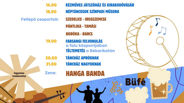 3 néptánccsoport lép színpadra, maskarás felvonulással járjuk be a falu központját, majd elégetjük a telet a Békaríkatón, hogy helyet adjunk a tavasznak!