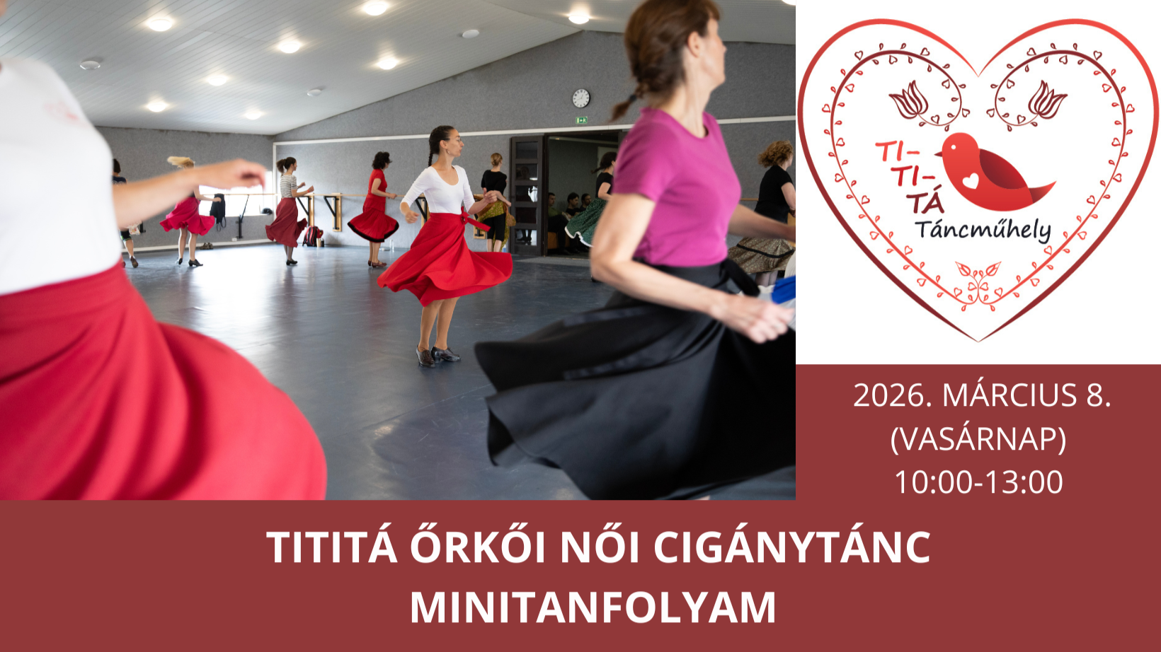 Januártól ismét indulnak a Tititá Táncműhely havi rendszerességű női tánc- és forgástechnikai órái, melyek kifejezetten a néptáncos lányok technikai készségfejlesztését célozzák, mozgáskoordinációs és testtudatosító gyakorlatokkal, forgástechnikai elméleti és gyakorlati ismeretekkel, és női körben történő folkjóga gyakorlással együtt.