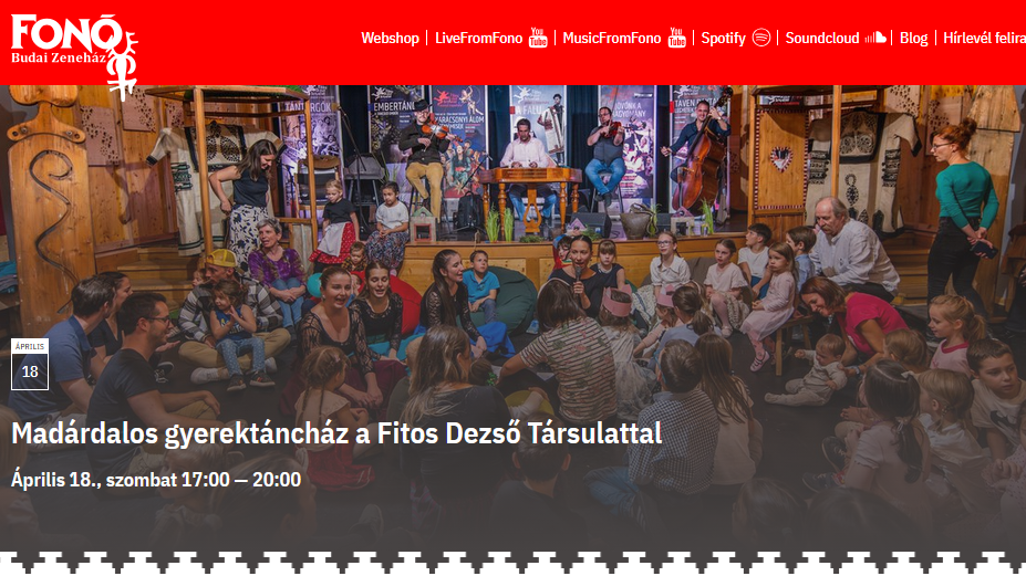 A tavasz érkezésével a Fonó tánctermébe is beköltözik a madárcsicsergés. Csatlakozzatok egy fergeteges táncos, énekes mulatsághoz! Várjuk a családokat népi játékokkal, vetélkedővel, játszóházzal!